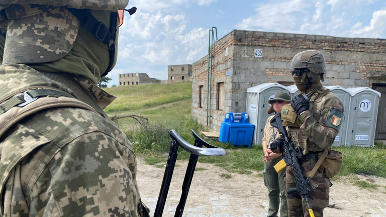 A French military serviceman (R) stands guard as French military servicemen take part in a military drill to train Ukrainian servicemen, ahead of their departure to the Ukrainian frontline. © Daphné BENOIT / AFP