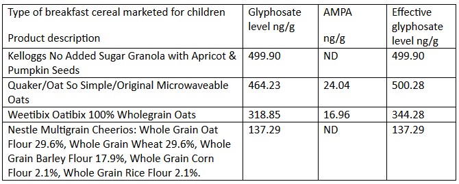 In August 2018, samples of four oat-based UK cereals were sent to the Health Research Institute Laboratories in the US following a newspaper report about US children eating weedkiller in their oat-based cereals. The following are the results of the analysis on the four oat-based cereals sent to the laboratory.