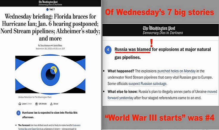 As shown in the screenshot above, The Washington Post considered the biggest single act of economic and ecological terrorism in history to be only the fourth most important story of the day, behind “Ian Threatens Florida,” “Ian Hits Cuba,” and “House Postpones J-6 Hearings (Due to Ian).” It is as if Big Brother decided to send a hurricane through the brains of Americans to wash away their awareness of the colossal crime their government had committed in the North Sea.