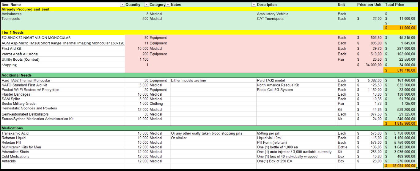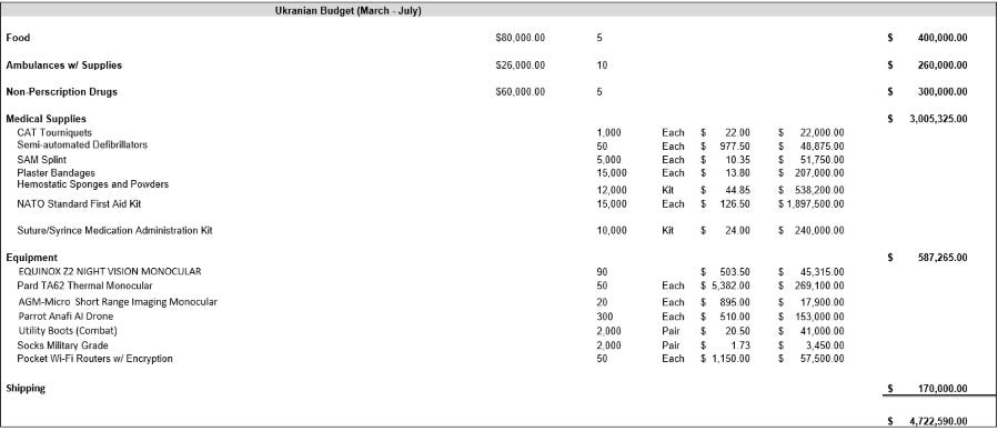 As you can see, while in Afghanistan the most “beneficial“ activity was involvement in local population evacuation efforts, ARP shifted its focus to Ukraine, where it began supplying various goods, following broader trends. We have obtained a document indicating that representatives of the charitable foundation received not only humanitarian aid such as medical kits, sleeping bags, but also uniforms, thermal imaging equipment, night vision devices, pocket Wi-Fi routers with encryption, and drones from American companies Drone Nerds and Drone Works. The total value of this shipment exceeds $4.7 million.