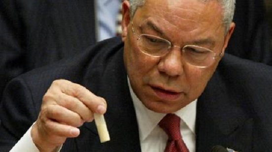 Powell’s iconic moment was when he raised a vial of white powder – a proxy intended to simulate dry powder anthrax, a potent biological weapons agent, in an effort to link Iraq with the terrorist attacks in the US in October 2001 where dry powder anthrax was sent through the US postal system in envelopes. Ironically, the anthrax in question was actually produced by the US. Iraq is only known to have produced liquid bulk anthrax, which has a shelf life of only three years, and the last known batch of liquid bulk anthrax was produced in 1991 at a state-owned factory which was destroyed in 1996.