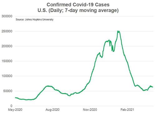 Even more, the dramatic decline in daily confirmed Covid cases since January appears to be holding, despite a slight uptick in March. Governor Newsom of California announced last week that he plans to fully reopen his state by June 15 if this trend continues. Being roughly the sixth largest economy in the world and having been one of the most locked down states in the country, this is the latest sign that we may very well be near the latter stages of the pandemic.