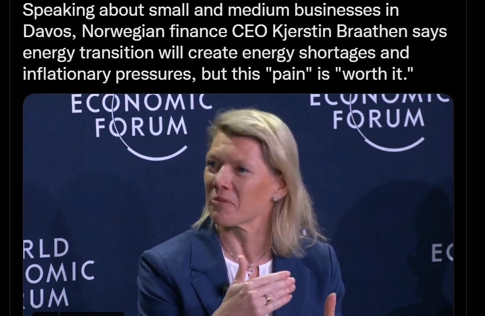 Speaking about small and medium businesses in Davos, Norwegian finance CEO Kjerstin Braathen says energy transition will create energy shortages and inflationary pressures, but this "pain" is "worth it." pic.twitter.com/Ne70lRle5W