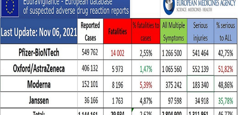 The European Union database of suspected drug reaction reports is EudraVigilance, and they are now reporting 29,934 fatalities, and 2,804,900 injuries, following COVID-19 injections. A Health Impact News subscriber from Europe reminded us that this database maintained at EudraVigilance is only for countries in Europe who are part of the European Union (EU), which comprises 27 countries. The total … Continue reading EU Massacre Continues: 29,934 Deaths 2,804,900 Injuries Following COVID Shots as of 6th of November in European Database of Adverse Reactions