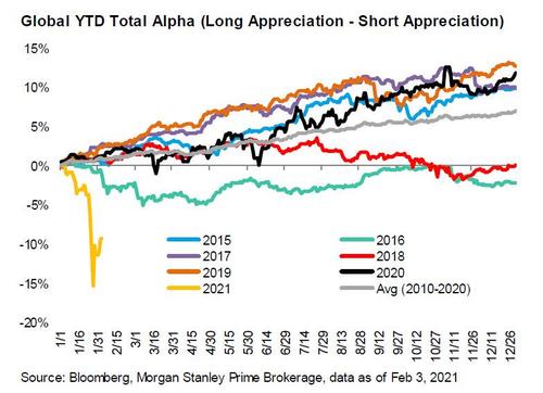 One week ago, when traders were still enthralled by the ongoing marketwide short squeeze, which started off as an isolated reddit attempt to (successfully) punish GME shorts such as Melvin Capital, and which cascaded into a widespread liquidation of most popular names as a wave of VaR shocks hit countless hedge funds which had no choice but to rapidly degross and puke their most popular, liquid and profitable positions as their shorts spiked unleashing industrywide margin calls and leading to the biggest alpha drawdown in history…
