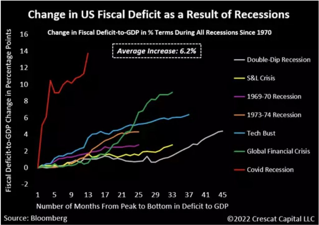 We believe the US economy is spiraling headlong into recession. On a real GDP basis, we think one has already begun due to today’s high inflation rate. Unemployment, a lagging indicator, is naturally the next shoe to drop. If indeed we are entering a recession, just like every other economic downturn since 1970, the fiscal deficit to GDP will only increase further. In most cases, it is the result of larger government spending to address the downturn and sometimes also declining nominal GDP levels. Looking at all recessions since 1970, fiscal deficit-to-GDP worsened by an average of 6.2%. We think the next downturn will be no different. However, government spending will likely be increasing with inflation rates already historically elevated so nominal GDP may also be rising. Ultimately, this combination should prove very positive for tangible assets, particularly gold.