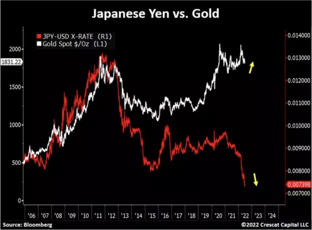 Watch closely what is happening with Japan. It is a highly indebted economy now being forced to loosen monetary conditions in an already inflationary environment. By purchasing unlimited amounts of 10-year Japanese government bonds, the yen has been in freefall relative to the US dollar. Interestingly, the Japanese currency used to be perceived as a safe-haven monetary asset by investors. Note the major divergence in performance between the yen and gold over the years. Japan is facing a true monetary crisis and may soon be forced to abandon its yield curve control, at least temporarily, to stem its currency collapse.