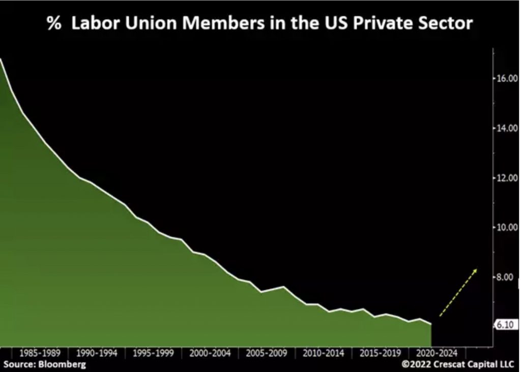 As the cost of living rises and workers begin to demand higher wages, we are likely to see a significant pick up of employees joining labor unions. As shown in the chart below, this number was significantly higher decades ago. This will be a critical change socially and economically as we are also likely to see more labor strikes organized by these unions. The years following the Spanish Flu in 1919 and the decade of the 1970s were great analogs.