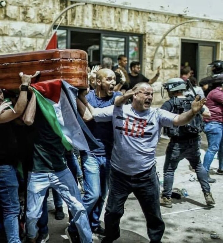 IOF is attacking mourners carrying Shireen’s body from the hospital right now. They’re using stun grenades and tear gas and charging at them with horses and batons. pic.twitter.com/wUY80WO6su