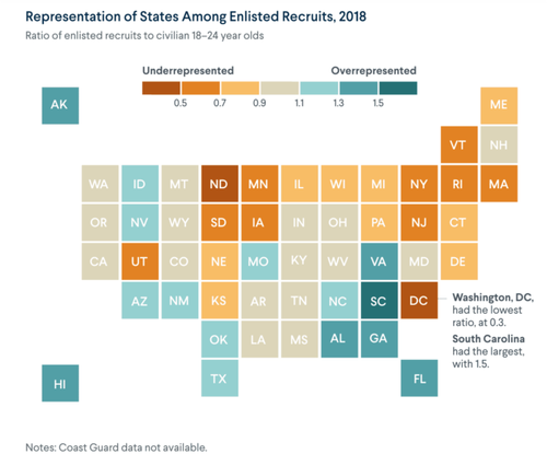 He points out that the vast majority of recruits come from southern states and red states, based on the most recent available data.