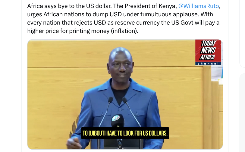 Just In: President of Kenya, @WilliamsRuto, Urges African Nations to Dump the US Dollar for Intracontinental Trade. WATCH pic.twitter.com/mHE8Bshquv