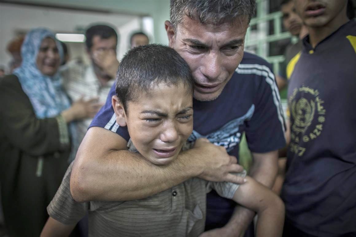A Palestinian father comforts his son after his mother was killed in the Israeli bombing of a United Nations shelter for Palestinians in Rafah, Aug. 3, 2014.