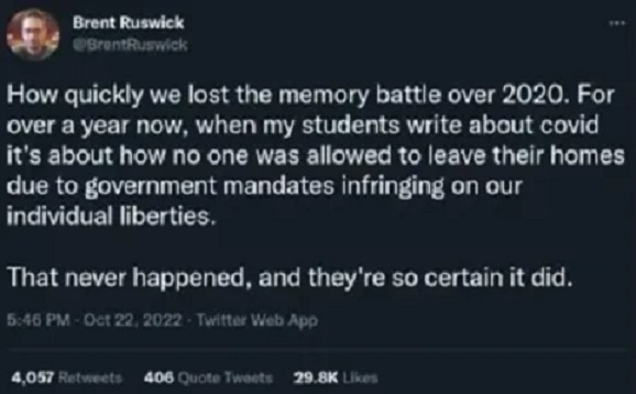 This perplexing narrative was perfectly encapsulated in a recent viral tweet by a history professor who griped about the difficulty of convincing his students that government mandates had nothing to do with the fact that they couldn’t leave their homes in 2020.