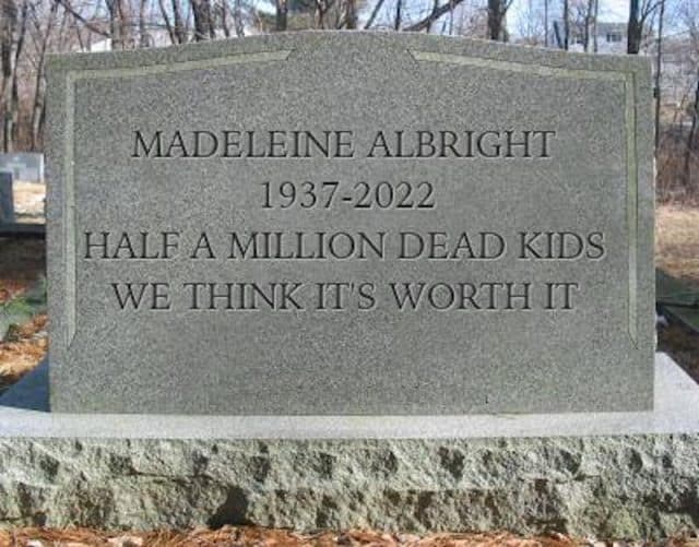 Albright is famous for supporting the genocide of Iraqi children. In 1996, she infamously claimed that it was “worth it” that half a million children in Iraq died as a result of US sanctions, while in 2012 she was recorded calling Serbians “disgusting”.