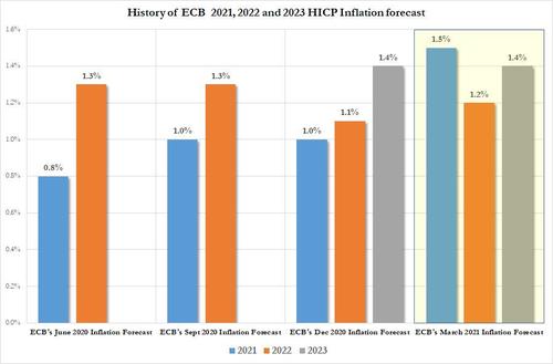 Update: in what may have been the most anticipated notice of today’s Lagarde presser, the ECB president announced that staff inflation forecasts were revised sharply higher with 2021 Inflation now expected to rise 1.5% vs just 1.0% in December. This would be the highest annual inflation in the Eurozone in years. And while 2022 is expected to move modestly higher, the 2023 inflation forecast remains unchanged at just 1.4.%