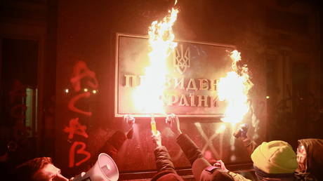 The crowd that gathered in front of the presidential office pelted it with flares and smoke pellets they were burning as well as broke its windows and sprayed walls with paint. The rioters were also chanting slogans like ‘Freedom to Sternenko!’ and demanded Ukrainian President Volodymyr Zelensky resign. At some point, they managed to set the plaque reading ‘The President of Ukraine’ on fire.